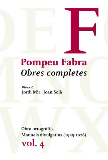 El quart volum de les Obres completes de Pompeu Fabra recull dos grups de textos: l'obra ortogràfica més important de Fabra i els volumets que el gramàtic va publicar a l'editorial Barcino els anys 1925 i 1926. El volum presenta així mateix les Normes ortogràfiques de l'IEC (1913), una gran fita en l'ortografia normativa del català modern, i el Diccionari ortogràfic (1917), del qual es reprodueix la segona edició, amb correccions i addicions respecte de la primera.