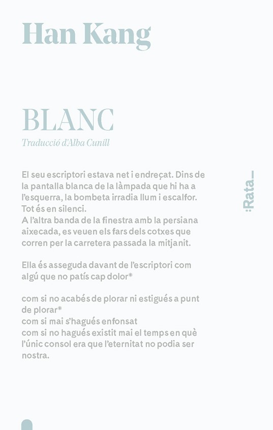 En algunes cultures orientals el blanc és el color del dol. Potser les coses blanques que ens envolten preserven el nostre dolor, contenen una angoixa que no sabem veure a primer cop d'ull. Kang s'endinsa en una delicada indagació literària i cerca, a través de la descripció de coses quotidianes, el mal que sempre ha sentit per l'absència d'una germana a qui no va conèixer.