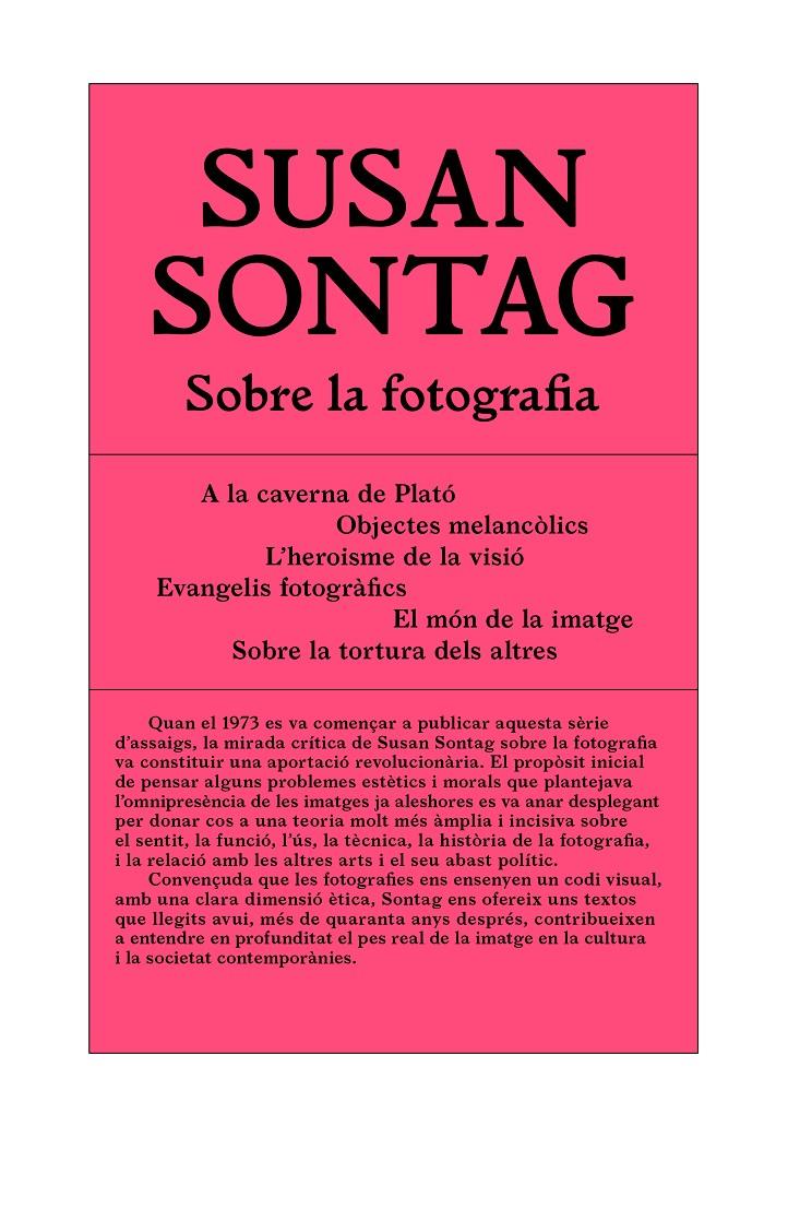 Quan el 1973 es va començar a publicar aquesta sèrie d’assaigs, la mirada crítica de Susan Sontag sobre la fotografia va constituir una aportació revolucionària. El propòsit inicial de pensar alguns problemes estètics i morals que plantejava l’omnipresència de les imatges ja aleshores es va anar desplegant per donar cos a una teoria molt més àmplia i incisiva sobre el sentit, la funció, l’ús, la tècnica, la història de la fotografia, i la relació amb les altres arts i el seu abast polític.