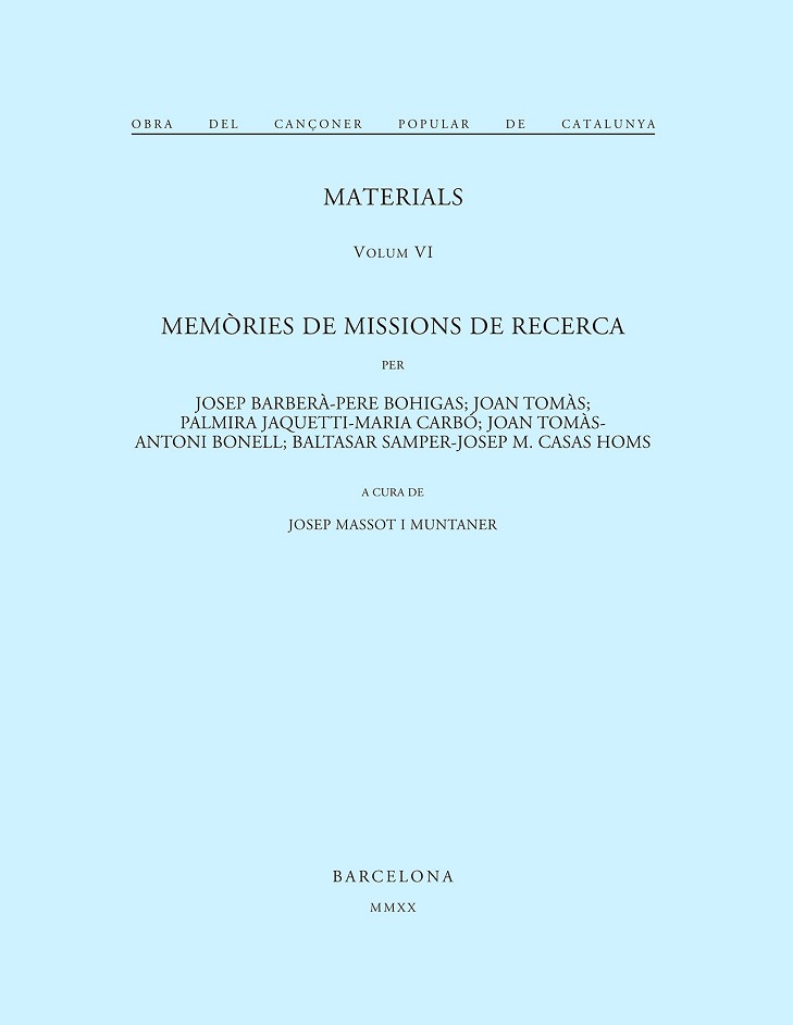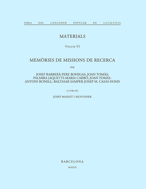 Missions fetes a la comarca del Vallès (1924-1924), a les Peces d'Albinyana (1925), a la Seu d'Urgell, Pallars i Vall d'Aran (1925), a la comarca d'Olot (1925) i a Mallorca: Llucmajor, Montuïri, Randa, Campos, Porreres, Algaida, Pina, es Capdellà (1925). Edició de les memòries corresponents, d'un gran interès musical i etnogràfic; selecció de textos de cançons recollides (amb els textos musicals reproduïts en facsímil) i de les fotografies dels cantaires. Complets índexs de noms i de topònims, com en tots els volums posteriors.