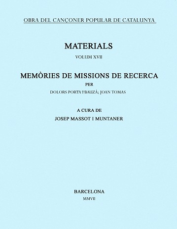 Edició de les memòries corresponents a les missions de recollida de cançons populars de Dolors Porta, als voltants de Palma de Mallorca, els estius de 1934 i de 1935; i de Joan Tomàs i Joan Llongueres i Galí, per la vall de Ribes, la Cerdanya i el Beridà, l?estiu de 1935, les darreres que va dur a terme l?Obra del Cançoner abans del col·lapse de la guerra civil.