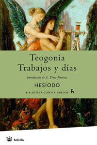 Poco se sabe de la vida de Hesíodo excepto lo que el propio autor ha hecho constar su obra, donde se presenta como un campesino, un pastor de cabras que apacenta su rebaño cerca del monte Helicón cuando se le aparecen las musas para incitarlo a dedicarse a la poesía, convirtiéndose de este modo en la primera encarnación del poeta como objeto involuntario de la inspiración divina. Trabajos y días consta de unos ochocientos versos, escritos (no se sabe si por el propio Hesíodo o por rapsodas posteriores, que habrían podido incluir fragmentos espurios) en el estilo coloquial que le caracteriza. Cantor del trabajo, Hesíodo subraya la importancia de la virtud en unos tiempos que considera decadentes, elabora preceptos morales y recoge consejos prácticos para la vida y el cultivo del campo. En la Teogonía, formalmente similar a Trabajos y días, el tema será muy otro, pues el autor no sólo se ocupa de los orígenes del mundo, que ya había historiado en Trabajos y días, sino que elabora una genealogía de los dioses griegos en donde figuran divinidades hasta entonces desconocidas o que al menos no figuraban en el canon homérico.